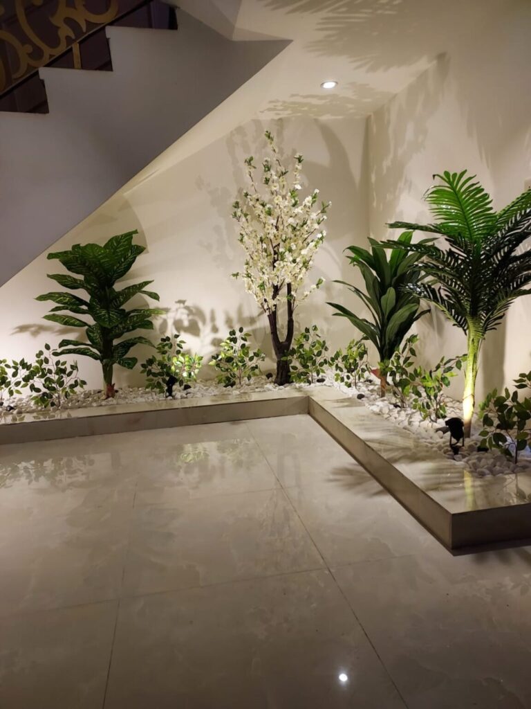 ديكورات حجريه وتصميمات بأشجار صناعيه أسفل الدرج مما يعطي مظهر رائع لمنزلك نختار الأشجار الصناعية بألوان رائعة .